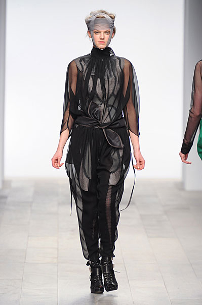 The devil is definitely in the detail with this trend, as Maria Grachvogel sent models out in swathes of draped black silk, with decidely deathly makeup (black lipstick, pallid skin with an ethereal glow) and chunky, talisman-style silver jewellery. A ruff of jet back feathers appeared to have been plucked straight from a raven's back.